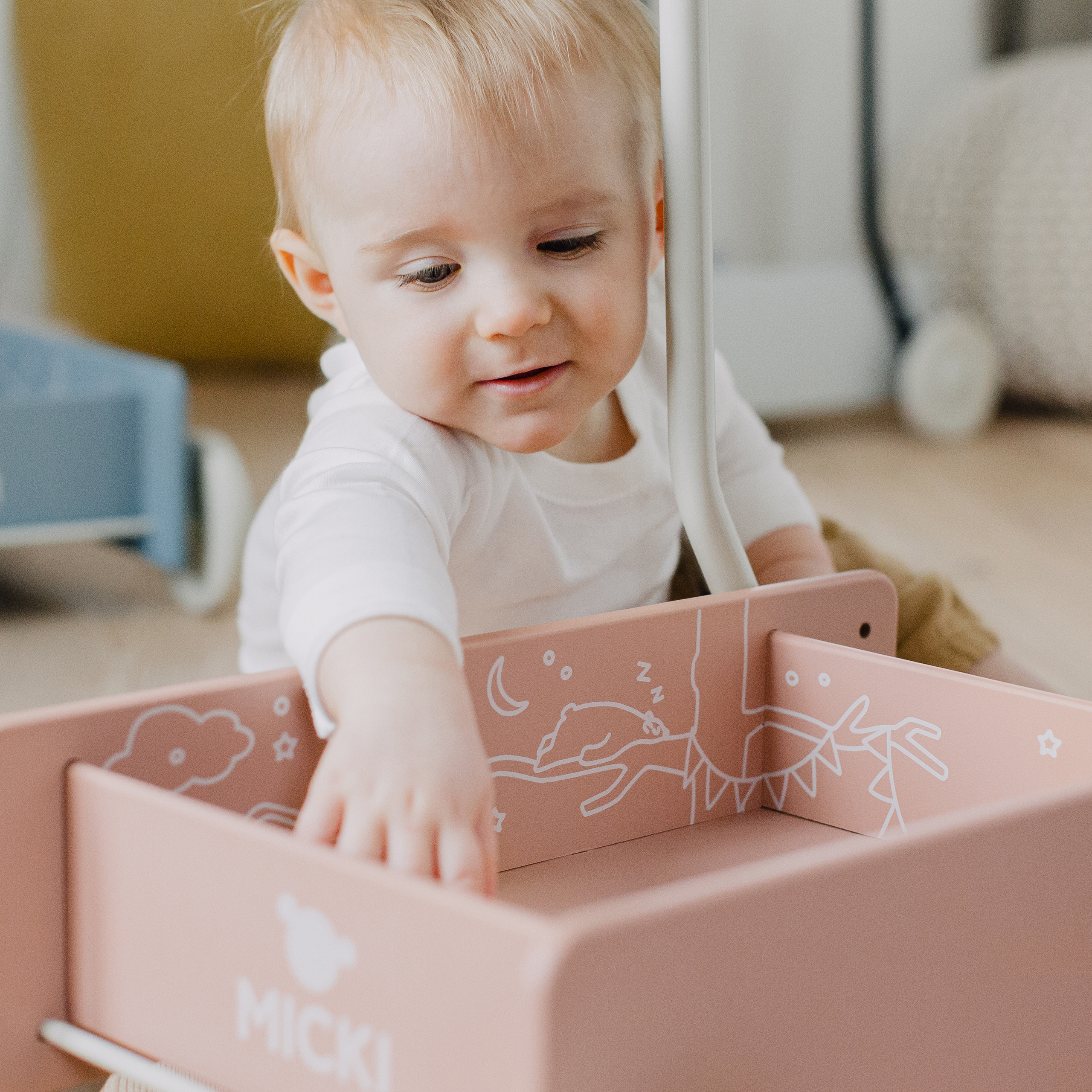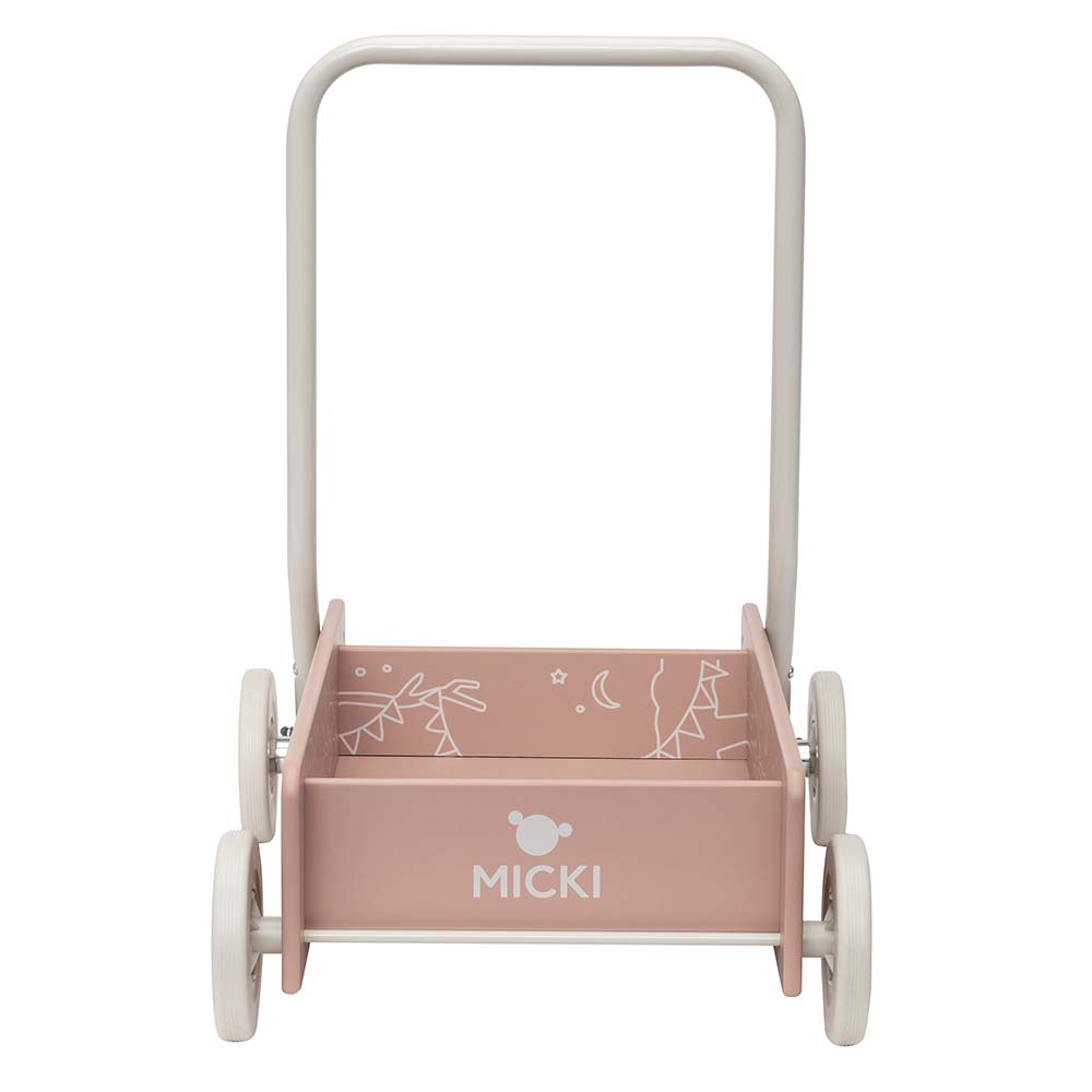 Dziecko podczas nauki chodzenia może zabrać swojego ulubionego misia na spacer w wózku lub przewozić klocki. Klasyczny chodzik Micki jest ozdobiony inspirującymi ilustracjami, dzięki czemu stanowi nie tylko narzędzie wspierające rozwój ruchowy, ale jest także kreatywną zabawką, która kieruje malucha w podróż pełną wyobraźni.