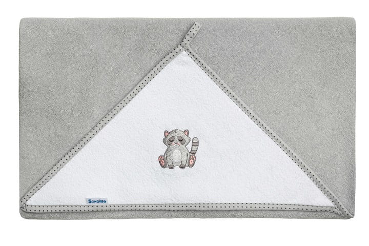 Okrycie wykonane z bawełny termo frotte z niewielkim dodatkiem poliestru. Jest miękkie, przyjemne w dotyku i łatwe w prasowaniu. Okrycie ma duży rozmiar 100x100 cm i obszerny kapturek z uroczym haftem.