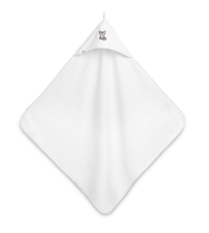 Okrycie wykonane z bawełny termo frotte z niewielkim dodatkiem poliestru. Jest miękkie, przyjemne w dotyku i łatwe w prasowaniu. Okrycie ma duży rozmiar 100x100 cm i obszerny kapturek z uroczym haftem.