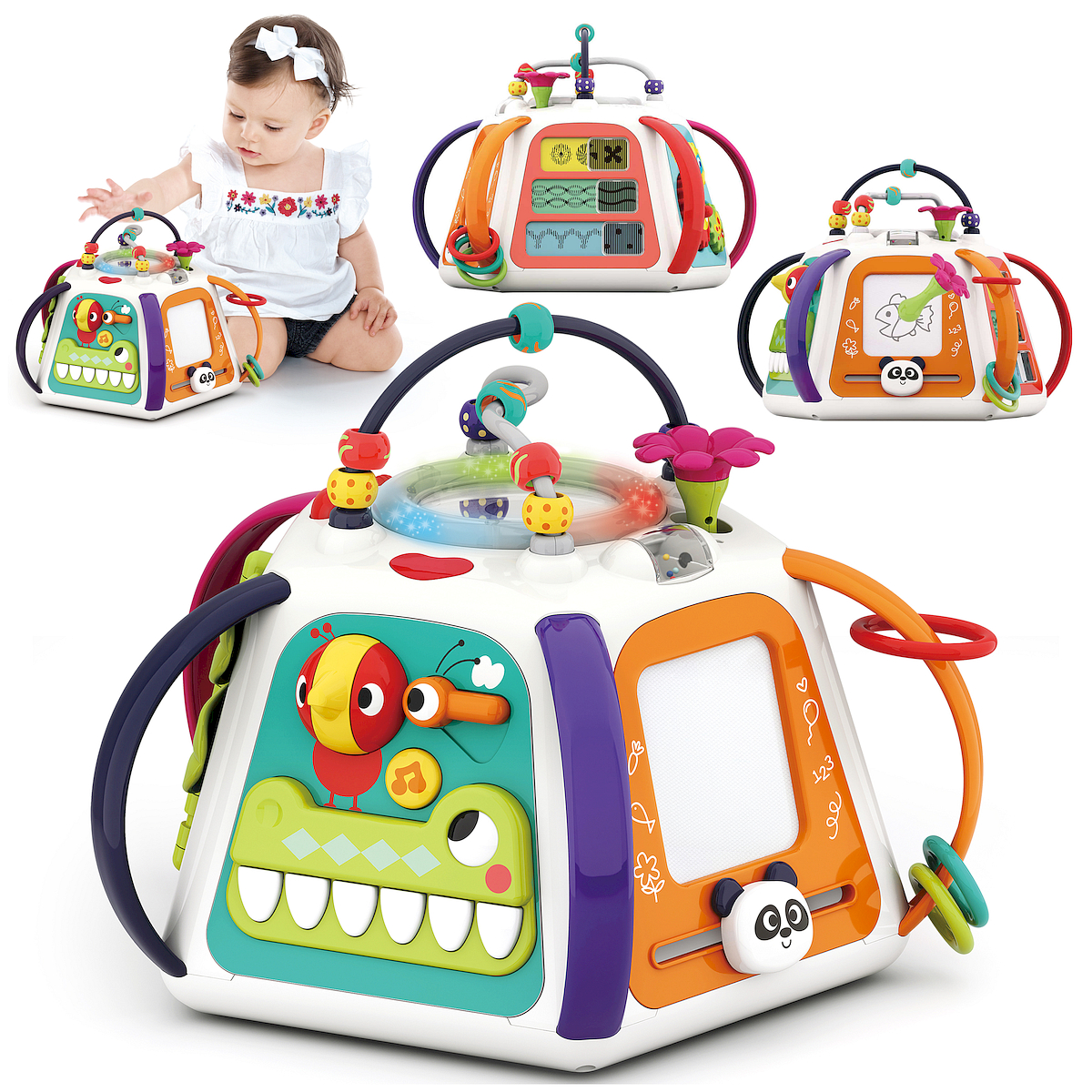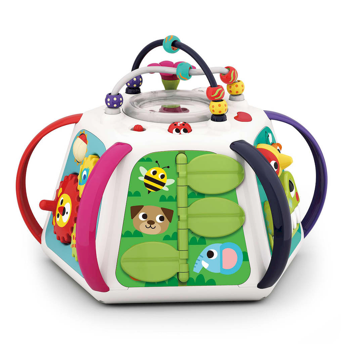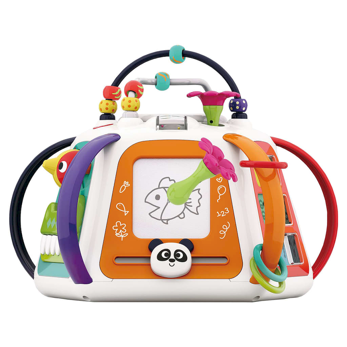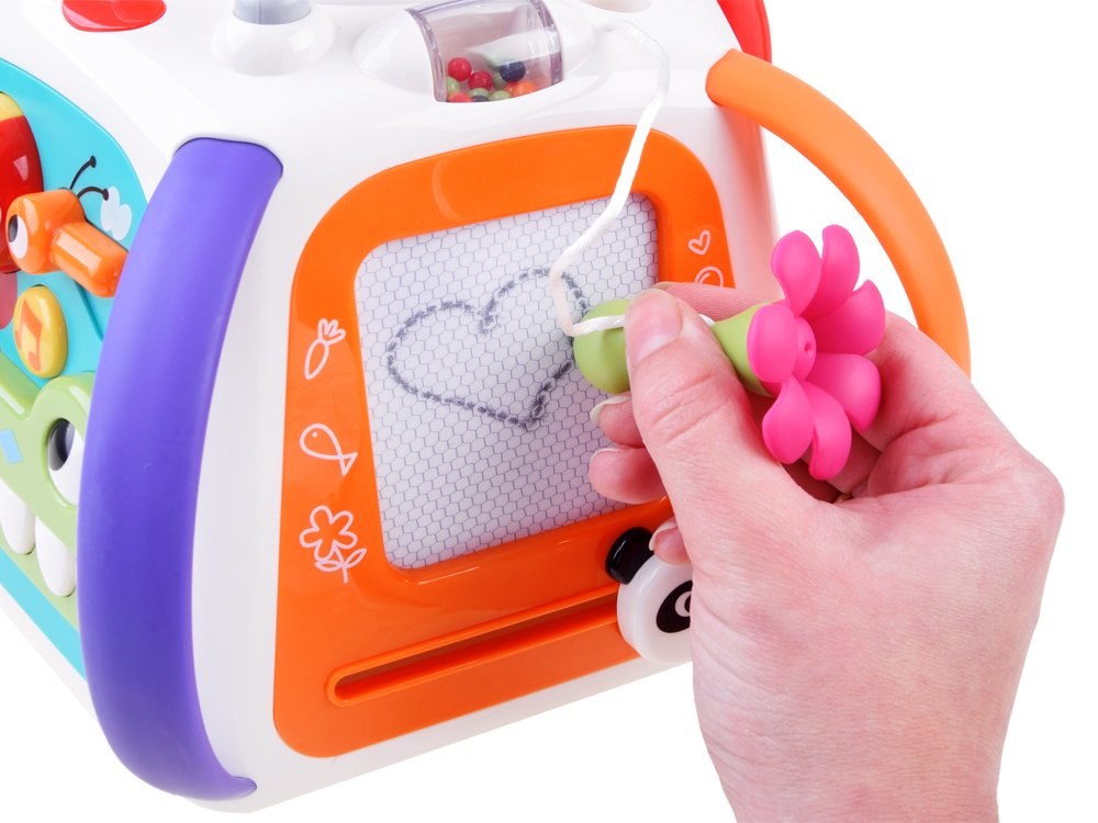 Centrum zabawy - pianinko, znikopis, koła zębate, dźwięki, melodie, światła, bezpieczne lusterko, efekty świetlne, przeplatanki z koralikami, odgłosy zwierzątek, suwaki animacji