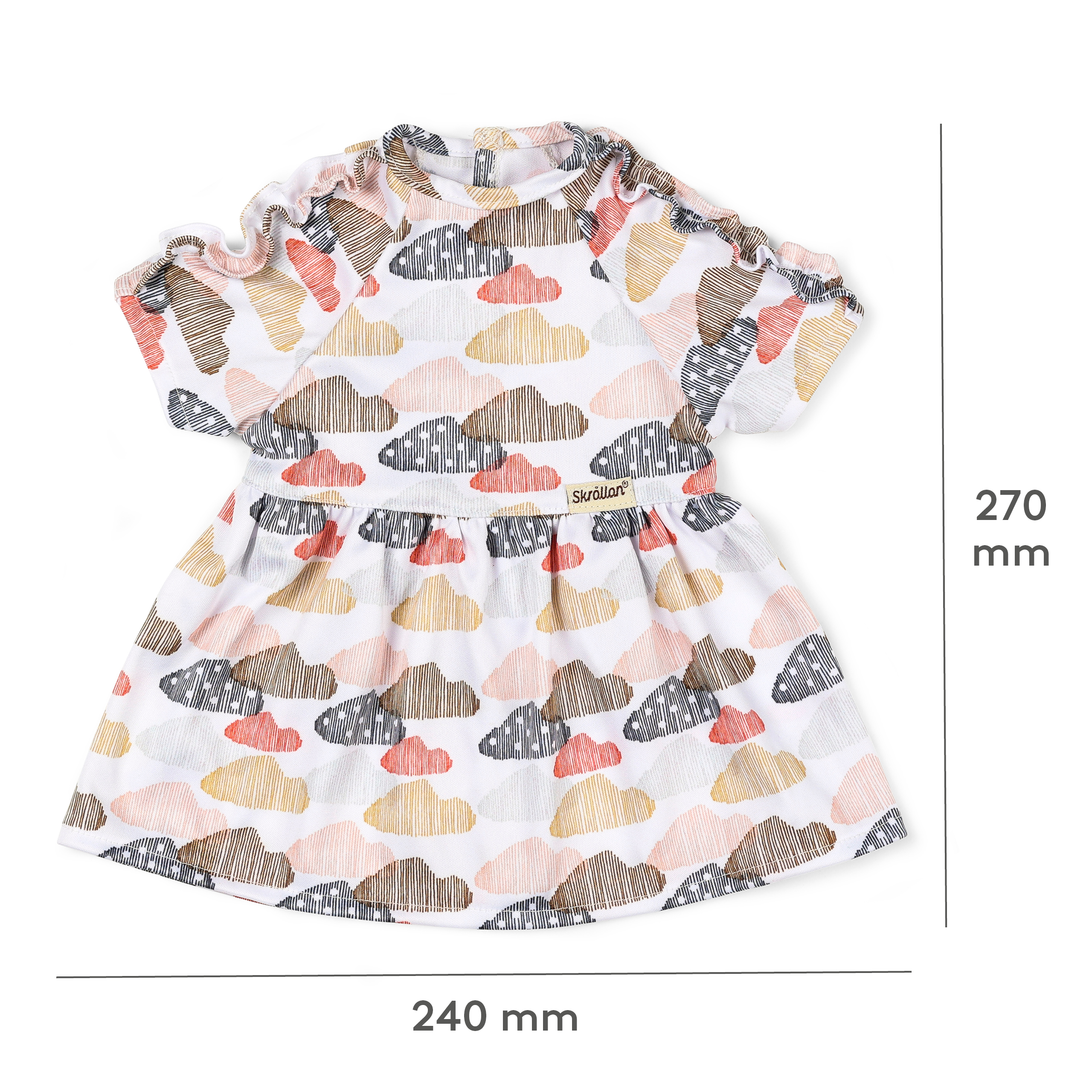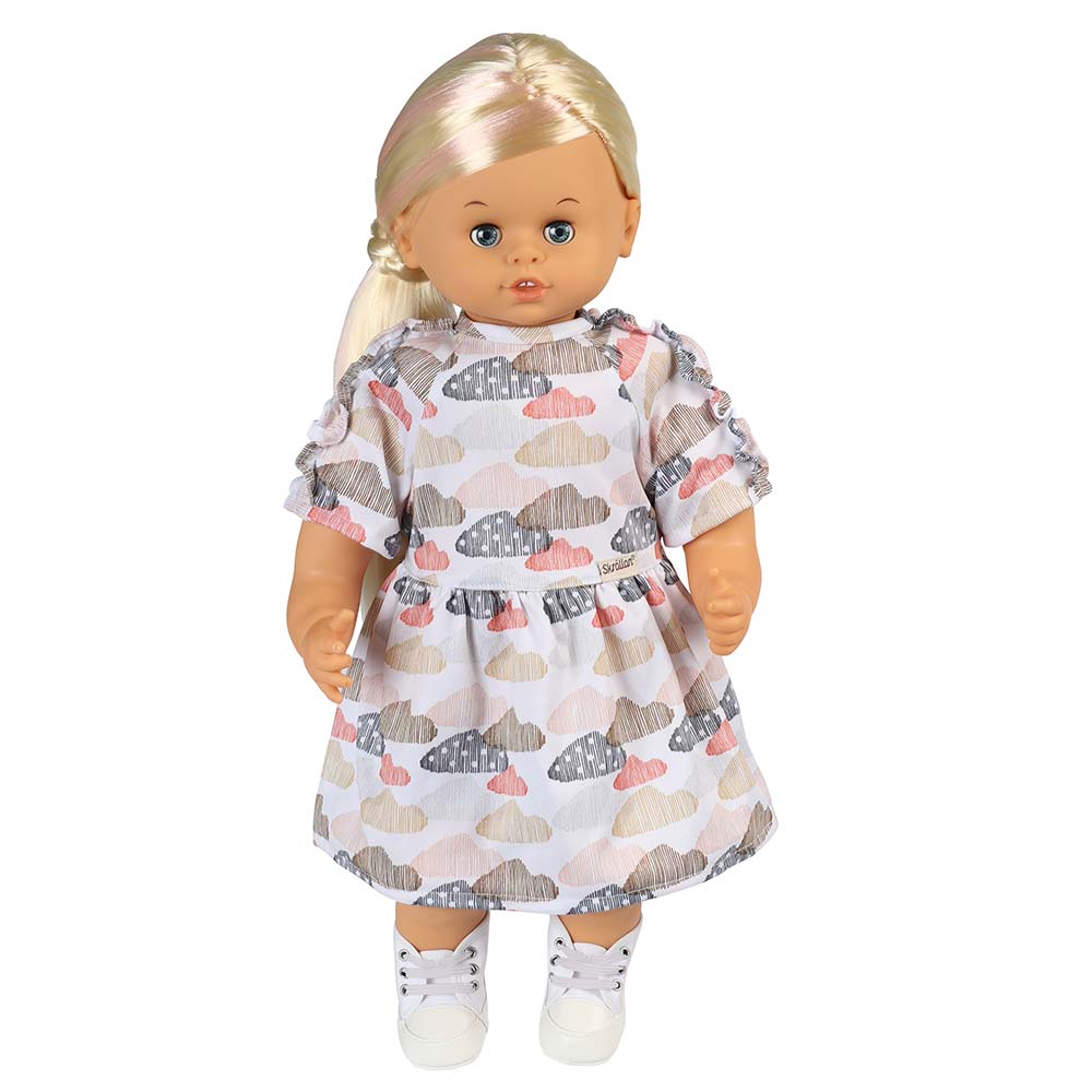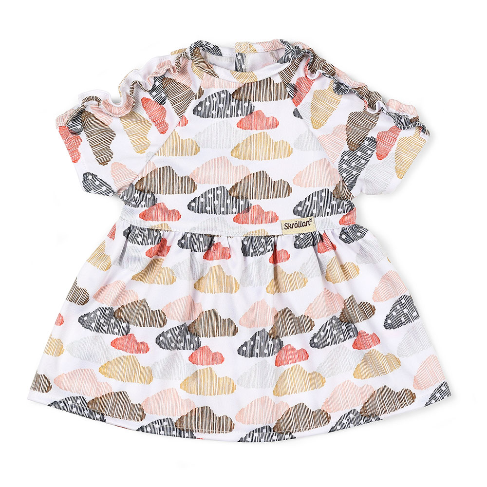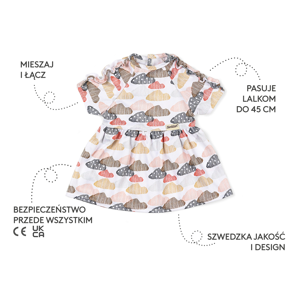 To jest ulubiona sukienka Twojej lalki, wykonana z miękkiego dżerseju z uroczymi detalami falbanek. Sukienkę zdobią kolorowe chmurki w pastelowych kolorach na białym tle. Ta sukienka ma zapięcie na rzep i można nosić ją zarówno na co dzień, jak i na specjalne okazje. Twórz nowe stylizacje łącząc ją z akcesoriami i ubraniami dla lalek marki Skrållan. Szwedzki design i wysoka jakość wykonania z dbałością o najmniejsze szczegóły są gwarancją dobrej zabawy dla dzieci w każdym wieku. Akcesoria sprzyjają rozwojowi kreatywności i rozwijają wyobraźnię.