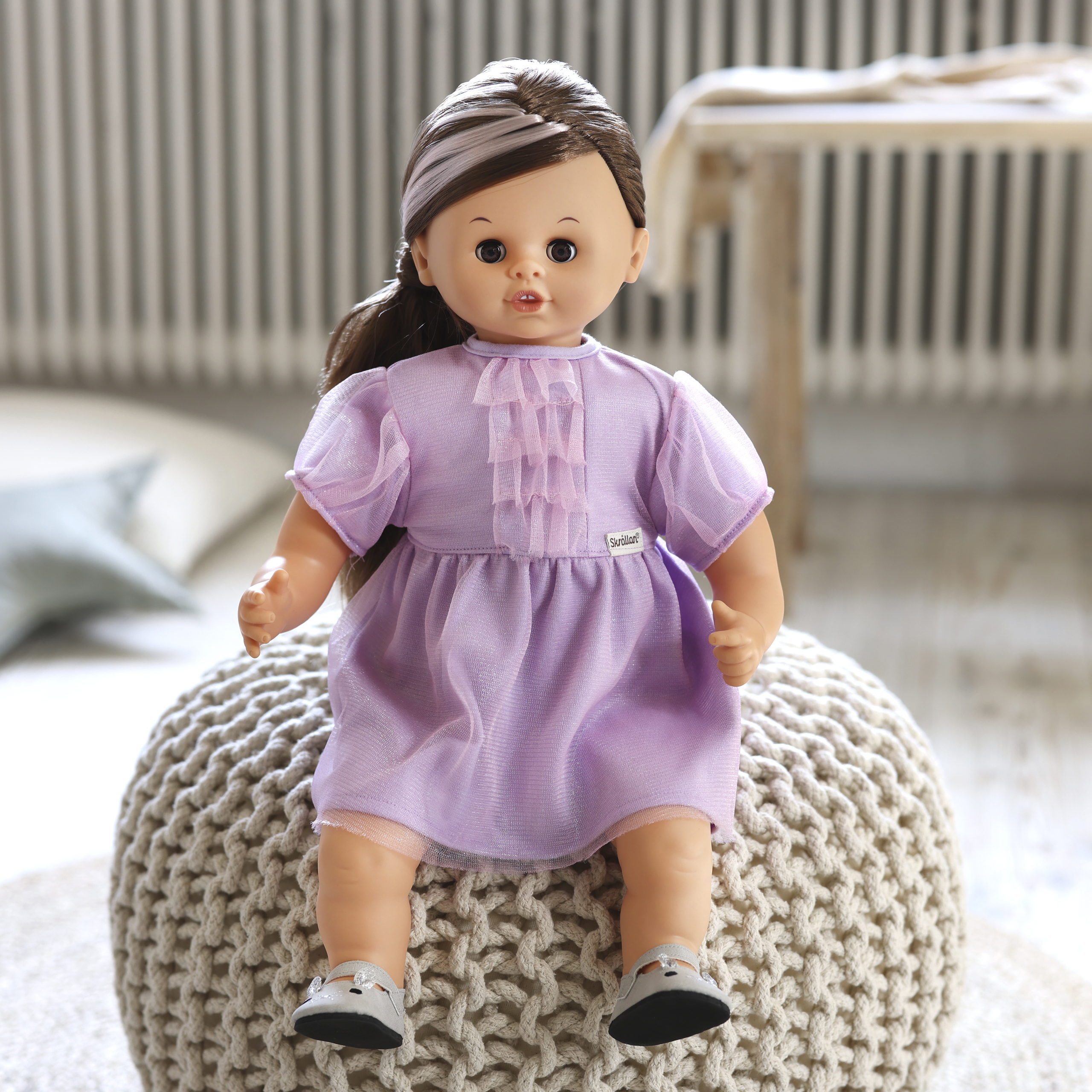 Błyszczący tiul, bufki na rękawkach oraz falbanka przy szyi sprawiają, że Twoja lalka wygląda zjawiskowo. Ta sukienka to obowiązkowy element garderoby każdej lalki, która lubi olśniewać i się wspaniale bawić. Fioletowa sukienka na przyjęcie z błyszczącym tiulem jest numerem jeden w garderobie każdej modnej lalki. Sukienka ma zapięcie na rzep.