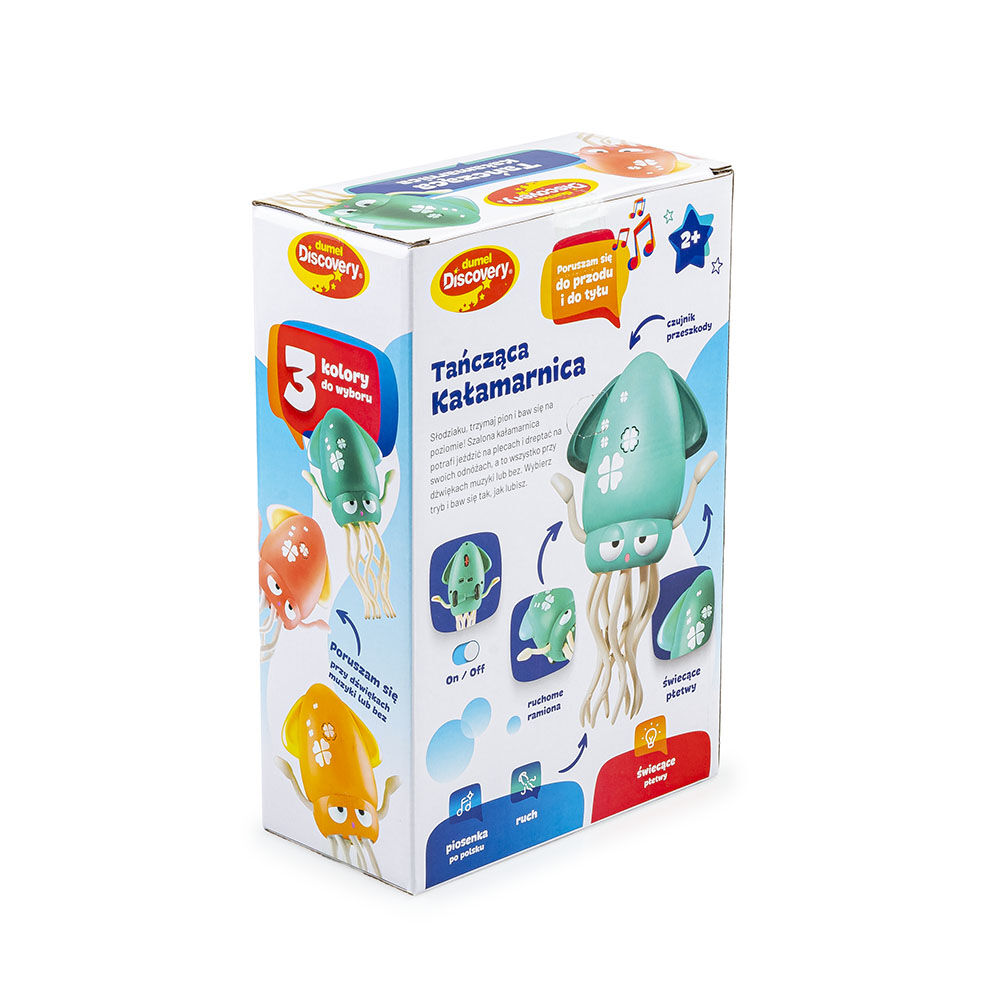 Potańczymy troszkę? Ta urocza kałamarnica zadba o trening nóżek, zachęcając maluchy do wspólnej zabawy! Zabawka śpiewa po polsku, a także odtwarza skoczną melodię, poruszając się w dwóch orientacjach. Gdy ustawimy ją pionowo na odnóżach, kałamarnica będzie tańczyć w miejscu. Kiedy natomiast położymy ją płasko, zacznie się poruszać do przodu i do tyłu. Zabawie towarzyszą kolorowe światełka, które „ożywiają” płetwy. Kałamarnica posiada przełącznik, który umożliwia ustawienie zabawki na tryb poruszania się bez melodii lub na całkowite jej wyłączenie.