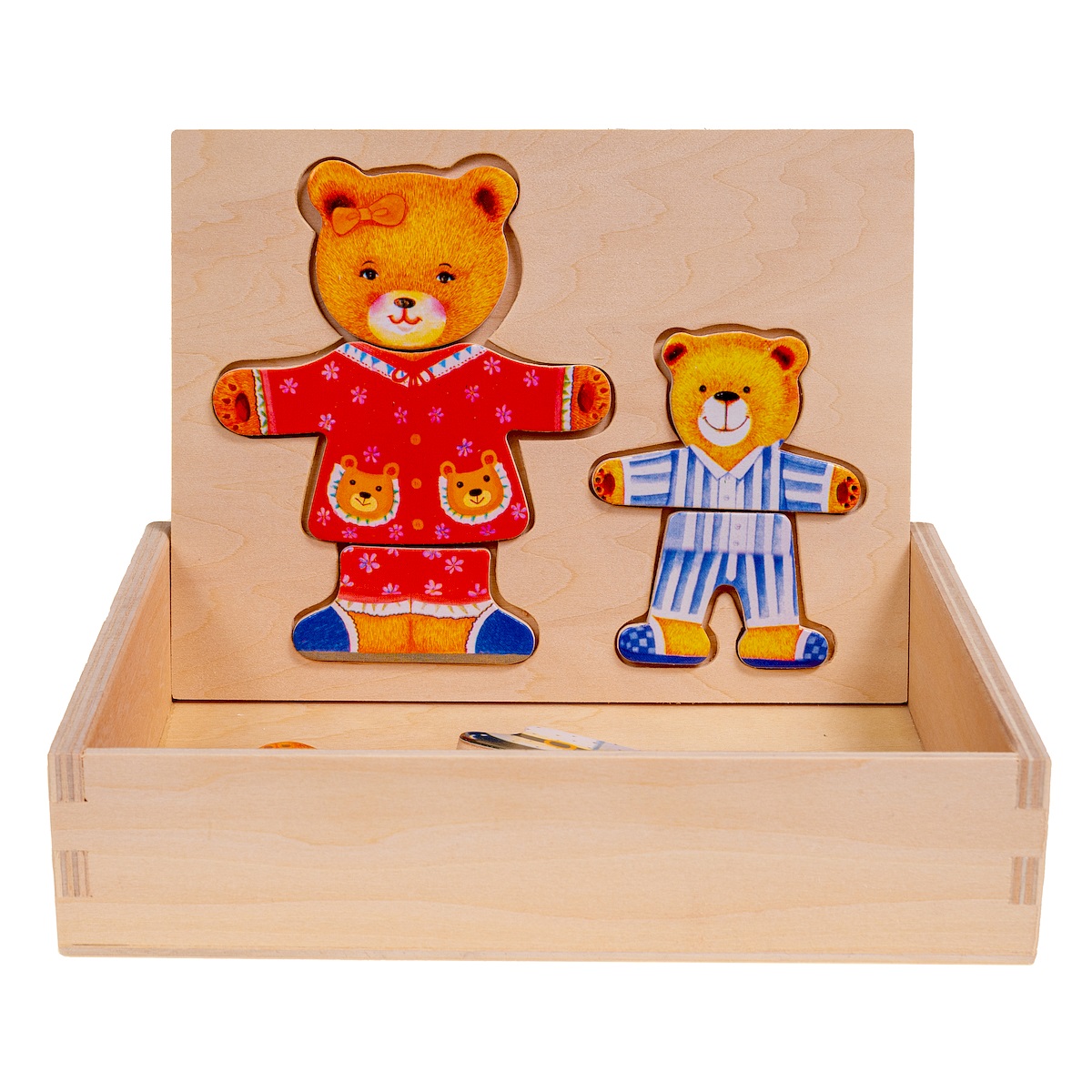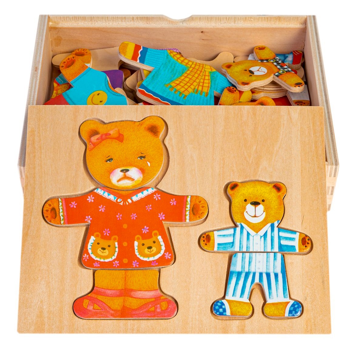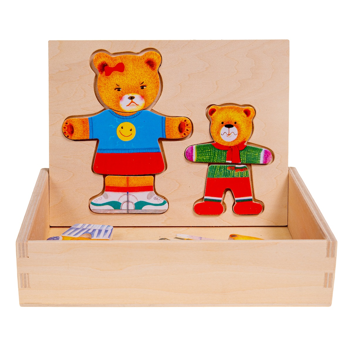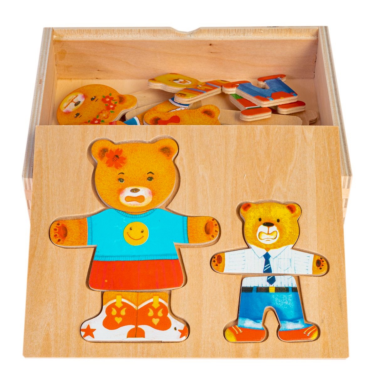 Drewniane puzzle to 2 wesołe misie do układania. Można zmienić im nastrój lub ubranie. Wszystkie elementy umieszczone są w drewnianym pudełku, co ułatwia utrzymanie zabawki w porządku po skończonej zabawie. Pudełko ma również funkcję formy na której układamy odpowiednie elementy.