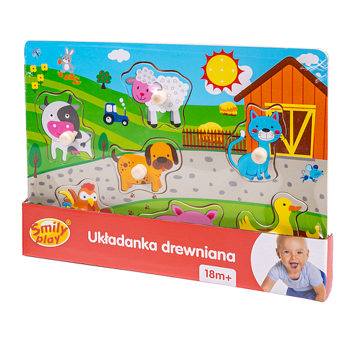 Drewniana układanka puzzle - uchwyty z wizerunkiem zwierząt z wiejskiej zagordy, farmy - Kurki, Kotka, Pieska, Owieczki, Kaczki etc. Puzzle mają duże uchwyty, które dziecko może wygodnie chwytać i układać w odpowiednich dla nich miejscach. Całość utrzymana w żywej, przyjemnej kolorystyce zachęci dziecko do zabawy i zapewni pozytywne doznania. Rozwija w dzieciach spostrzegawczość oraz wyobraźnię.