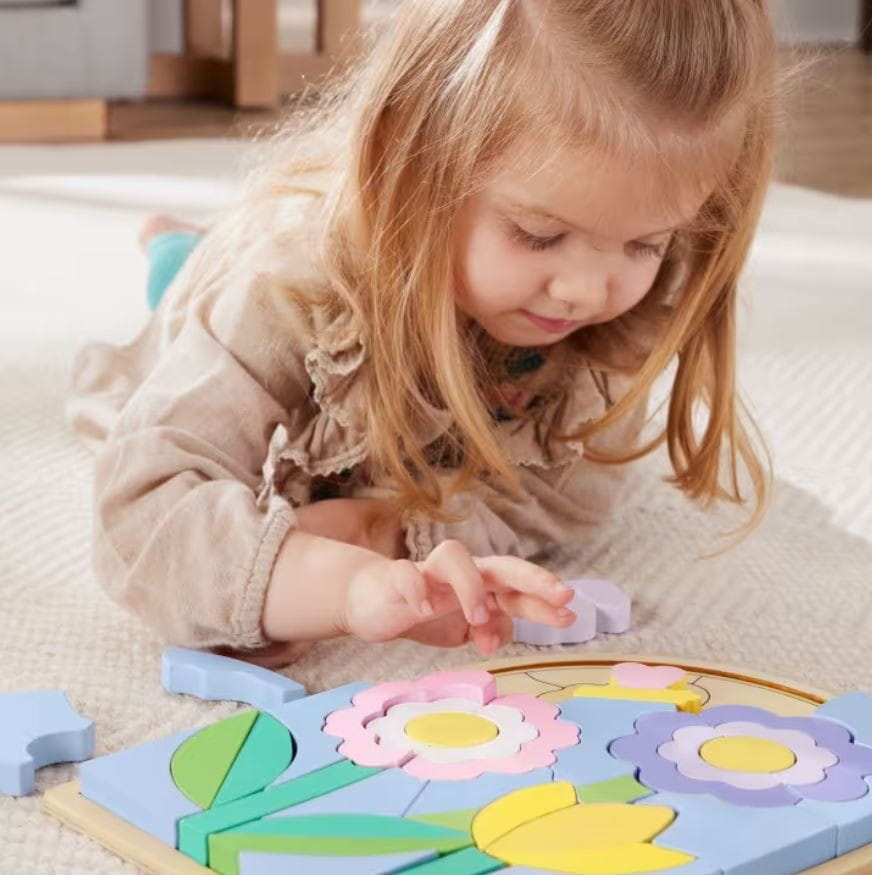 • Drewniana układanka dla dzieci z kwiatowym wzorem i klockami