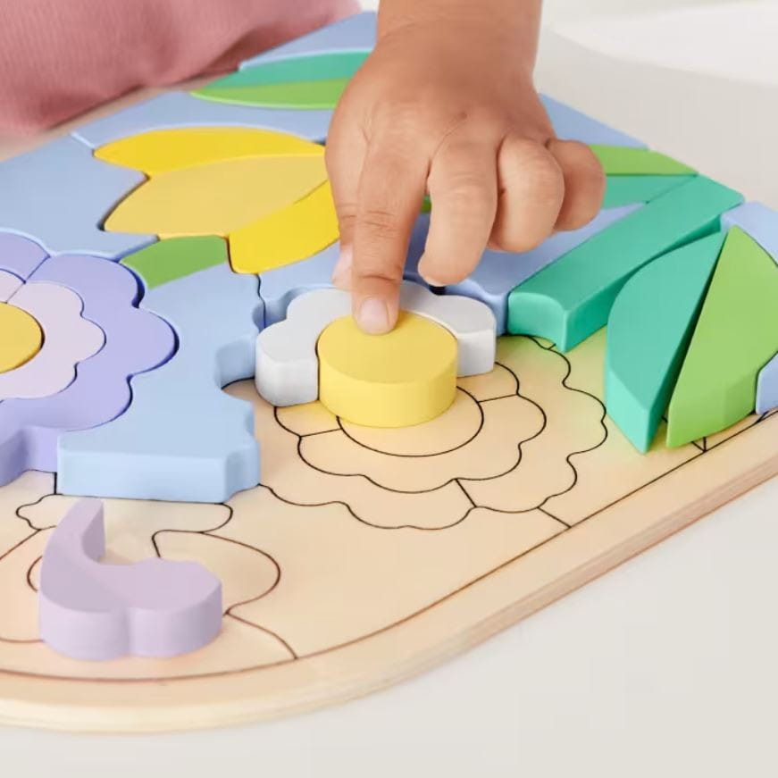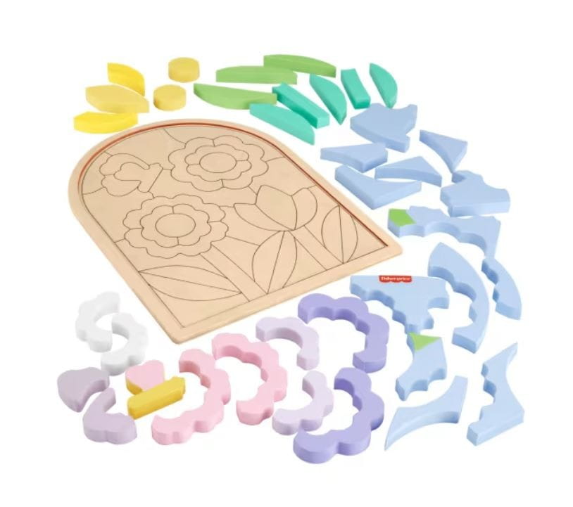 Ten zestaw Drewniane puzzle - kwiaty od Fisher-Price pozwala układać, sortować i tworzyć śliczne kwietne wzory. Wykonano go z drewna pochodzącego z prawidłowo zarządzanych lasów z certyfikatem FSC. Jest tu 37 klocków, które można dowolnie układać albo sortować na specjalnej podkładce z rowkami ułatwiającymi ułożenie kwiatowego ogrodu. Podczas układania i sortowania puzzli dzieci ćwiczą koordynację ręka-oko, kreatywność i umiejętność rozwiązywania problemów.