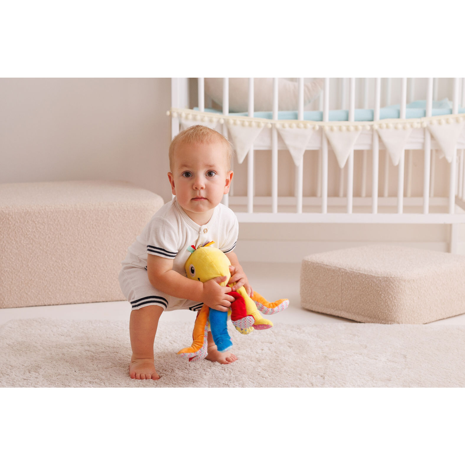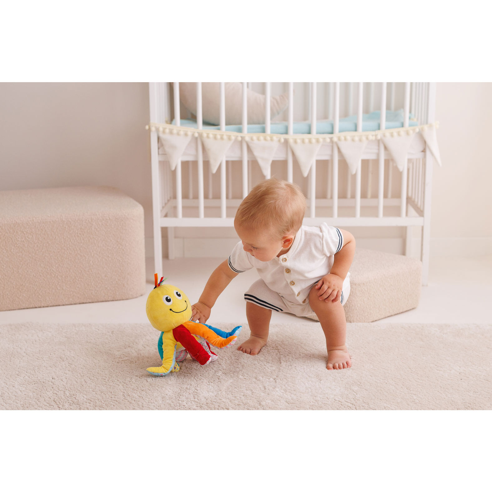 Tup, tup, tup, maszeruje zuch! Razem z kolorową ośmiorniczką postaw pierwsze kroki w świecie zabawy, ucząc się przy tym liczyć od 1 do 8. Zabawka porusza się do przodu na swoich barwnych odnóżach, aktywizując przy tym malucha, a żeby zachęcić ją do ruchu, wystarczy klasnąć w dłonie. Temu uroczemu przebieraniu odnóżami towarzyszą wesoły zwroty w języku polskim, zabawne odgłosy i piosenka.