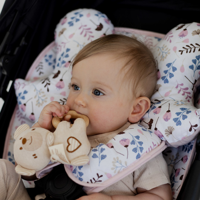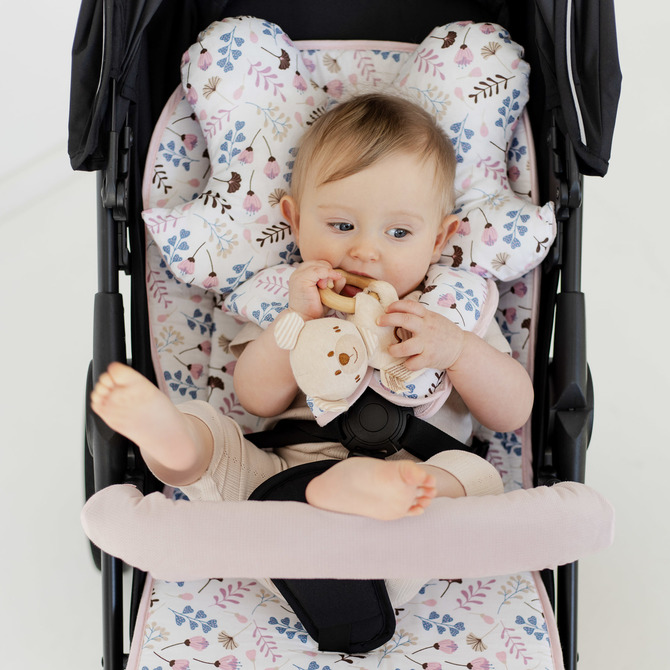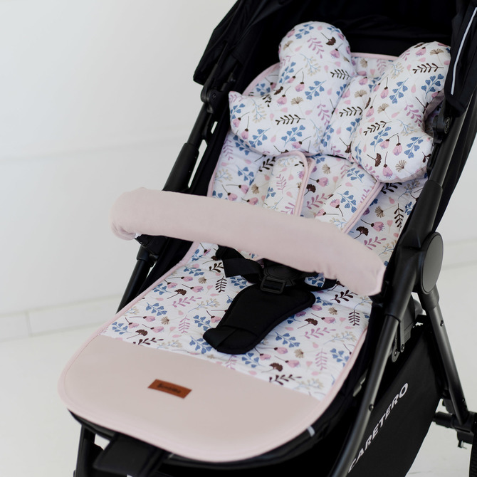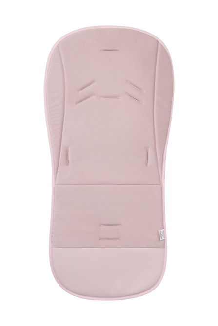 Uniwersalne nacięcia na pasy pozwalają na szybkie dopasowanie wkładki do większości wózków spacerowych, a dwustronna konstrukcja umożliwia zmianę wyglądu w zależności od potrzeb – elegancki velvet lub kolorowa, drukowana bawełna.