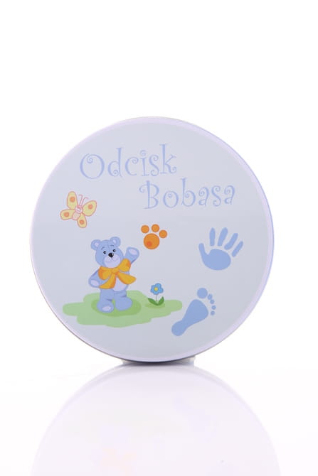 Zestaw składa się z ozdobnej puszki, w której umieszczona jest kolorowa masa gipsowa. Została ona tak przygotowana, aby było można w bardzo łatwy i szybki sposób przygotować ją do użycia, całkowicie samodzielnie. Wystarczy tylko wymieszać różową lub niebieską masę z zalecaną ilością wody, przełożyć do ozdobnej puszki, a następnie odczekać chwilę, aż zacznie tężeć. W tym momencie można już odcisnąć rączkę lub stopę Malucha oraz na spodzie wieczka wypełnić metryczkę, która zawiera miejsce na wpisanie imienia, wieku dziecka oraz datę zrobienia odcisku. Każdy z zestawów zawiera szczegółową instrukcję obsługi, dzięki czemu wykonanie masy do odcisku nie będzie stanowiło żadnego problemu. Wykonanie pamiątkowego odcisku rączki lub stopy Malucha z pewnością będzie doskonałą zabawą dla całej rodziny. Nasz „Odcisk Bobasa” to pomysł na świetną zabawę.