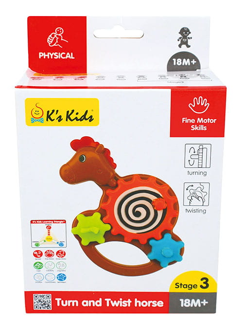 Zabawka edukacyjna konik daje mnóstwo radości, która jest połączona z nauką. Konik posiada trzy pokrętła i zębatki, dzięki którym jego główka porusza się w górę i w dół. Dziecko może złapać za poręczny uchwyt i zabrać zabawkę wszędzie ze sobą. Każdy element zabawek K's Kids jest zaprojektowany w taki sposób, aby wspomóc prawidłowy rozwój dzieci. Aby łatwiej było zrozumieć rodzicom, jakie zalety zawierają zabawy z produktami K's Kids, stworzono Trójkąt Umiejętności, który pokazuje czego dziecko potrzebuje dla prawidłowego rozwoju fizycznego, poznawczego oraz społecznego. Trójkąt Umiejętności to prosty przewodnik dla rodziców, pokazujący jakie umiejętności zdobywa lub rozwija dziecko w czasie zabawy daną zabawką i znajduje się na każdym opakowaniu produktów. Część zabawek jest zaprojektowana z myślą o rozwoju kilku sfer, inne mają za zadanie kształtować ich większą ilość-w zależności od potrzeb i możliwości dzieci znajdujących się na różnych etapach rozwoju. Jakie umiejętności może rozwinąć Twoje dziecko, podczas zabawy z konikiem? Rozwój fizyczny - zmysły - pobudzają ciekawość dziecka i zachęcają je do odkrywania rzeczy znajdujących się dookoła niego. Zabawki stymulujące zmysły są niezwykle ważne we wczesnym okresie rozwoju dziecka - motoryka mała - rozwija precyzyjne i kontrolowane ruchy, wraz z mimiką twarzy, koordynację wzrokowo-ruchową oraz prawidłową artykulację wyrazów - motoryka duża - to ruchy większych mięśni odpowiedzialnych za pracę ramion, nóg, stóp lub całego ciała. Zabawki zachęcają dziecko do kopania, raczkowania, biegania lub skakania Rozwój poznawczy - umiejętności logiczne - umożliwiają dzieciom łączenie skrawków informacji. Zabawki, takie jak układanki czy klocki, mogą wzmocnić dziecięcą inteligencję, układania w kolejności, koncentracji, argumentacji i rozwiązywania problemów Rozwój społeczny - poczucie własnej wartości - jest kompleksem osiągnięć, które dziecko odbiera od ważnych od siebie ludzi, w szczególności od rodziców i rówieśników. Kiedy dziecko może dokończyć zadanie, jakie stawia przed nim zabawka, jest z siebie zadowolone. Pomaga mu to w budowaniu silniejszego poczucia własnej wartości i lepszej samooceny.