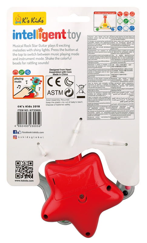 Wybierz właściwe zabawki rozwojowe dla Twojego dziecka. Muzyczna gitara gra 6 ekscytujących melodii oraz posiada efekty świetlne. Po naciśnięciu przycisku, znajdującego się na górze, można przełączyć się pomiędzy trybem muzycznym a trybem instrumentu. Zabawka posiada łatwy do złapania przez dziecko uchwyt, a dzięki koralikom w środku, może także służyć jako grzechotka. Każdy element zabawek K's Kids jest zaprojektowany w taki sposób, aby wspomóc prawidłowy rozwój dzieci. Aby łatwiej było zrozumieć rodzicom, jakie zalety zawierają zabawy z produktami K's Kids, stworzono Trójkąt Umiejętności, który pokazuje czego dziecko potrzebuje dla prawidłowego rozwoju fizycznego, poznawczego oraz społecznego. Trójkąt Umiejętności to prosty przewodnik dla rodziców, pokazujący jakie umiejętności zdobywa lub rozwija dziecko w czasie zabawy daną zabawką i znajduje się na każdym opakowaniu produktów. Część zabawek jest zaprojektowana z myślą o rozwoju kilku sfer, inne mają za zadanie kształtować ich większą ilość-w zależności od potrzeb i możliwości dzieci znajdujących się na różnych etapach rozwoju. Jakie umiejętności może rozwinąć Twoje dziecko, podczas zabawy z gitarą? Rozwój fizyczny zmysły - pobudzają ciekawość dziecka i zachęcają je do odkrywania rzeczy znajdujących się dookoła niego. Zabawki stymulujące zmysły są niezwykle ważne we wczesnym okresie rozwoju dziecka motoryka mała - rozwija precyzyjne i kontrolowane ruchy, wraz z mimiką twarzy, koordynację wzrokowo-ruchową oraz prawidłową artykulację wyrazów motoryka duża - to ruchy większych mięśni odpowiedzialnych za pracę ramion, nóg, stóp lub całego ciała. Zabawki zachęcają dziecko do kopania, raczkowania, biegania lub skakania Rozwój poznawczy kreatywność - rozwijanie wyobraźni małego dziecka jest nieodzowne w procesie kształtowania myślenia abstrakcyjnego i kreatywności. Cecha ta wpływa na zdolność do improwizacji, przejmowania inicjatywy i umiejętność rozwiązywania problemów Rozwój społeczny emocje - zdrowe dziecko powinno być w stanie wyrażać i kontrolować swoje emocje. Świadomość bycia kochanym i chronionym rozwija jego poczucie bezpieczeństwa. Zabawki, które mogą stać się przyjacielem dziecka i pomóc mu w wyrażaniu uczuć, spełniają bardzo ważną rolę w procesie uczenia się jak efektywnie kontaktować się z innymi, z obopólnym zaufaniem poczucie własnej wartości - jest kompleksem osiągnięć, które dziecko odbiera od ważnych od siebie ludzi, w szczególności od rodziców i rówieśników. Kiedy dziecko może dokończyć zadanie, jakie stawia przed nim zabawka, jest z siebie zadowolone. Pomaga mu to w budowaniu silniejszego poczucia własnej wartości i lepszej samooceny. Baterie: 2 x AAA.