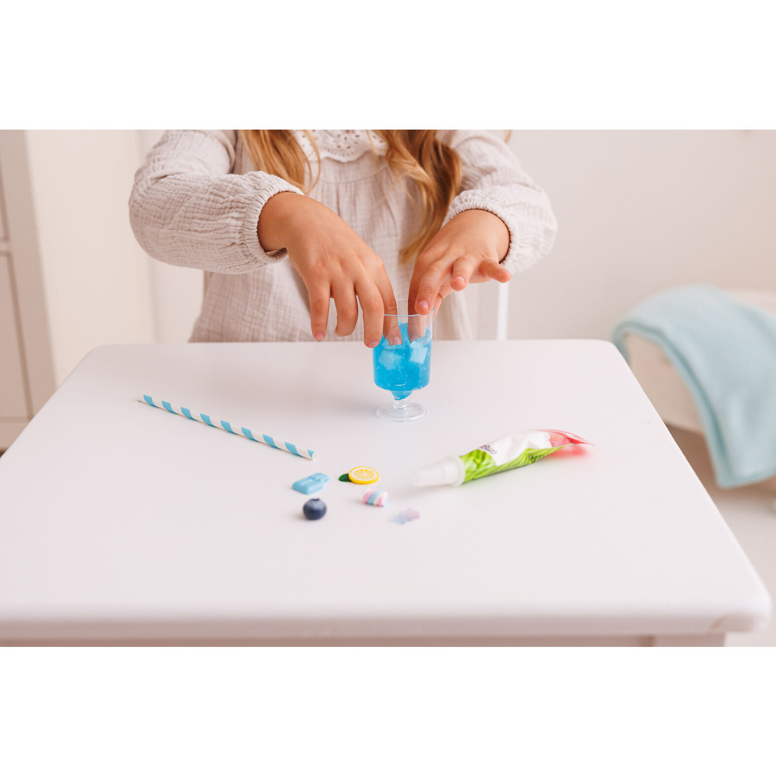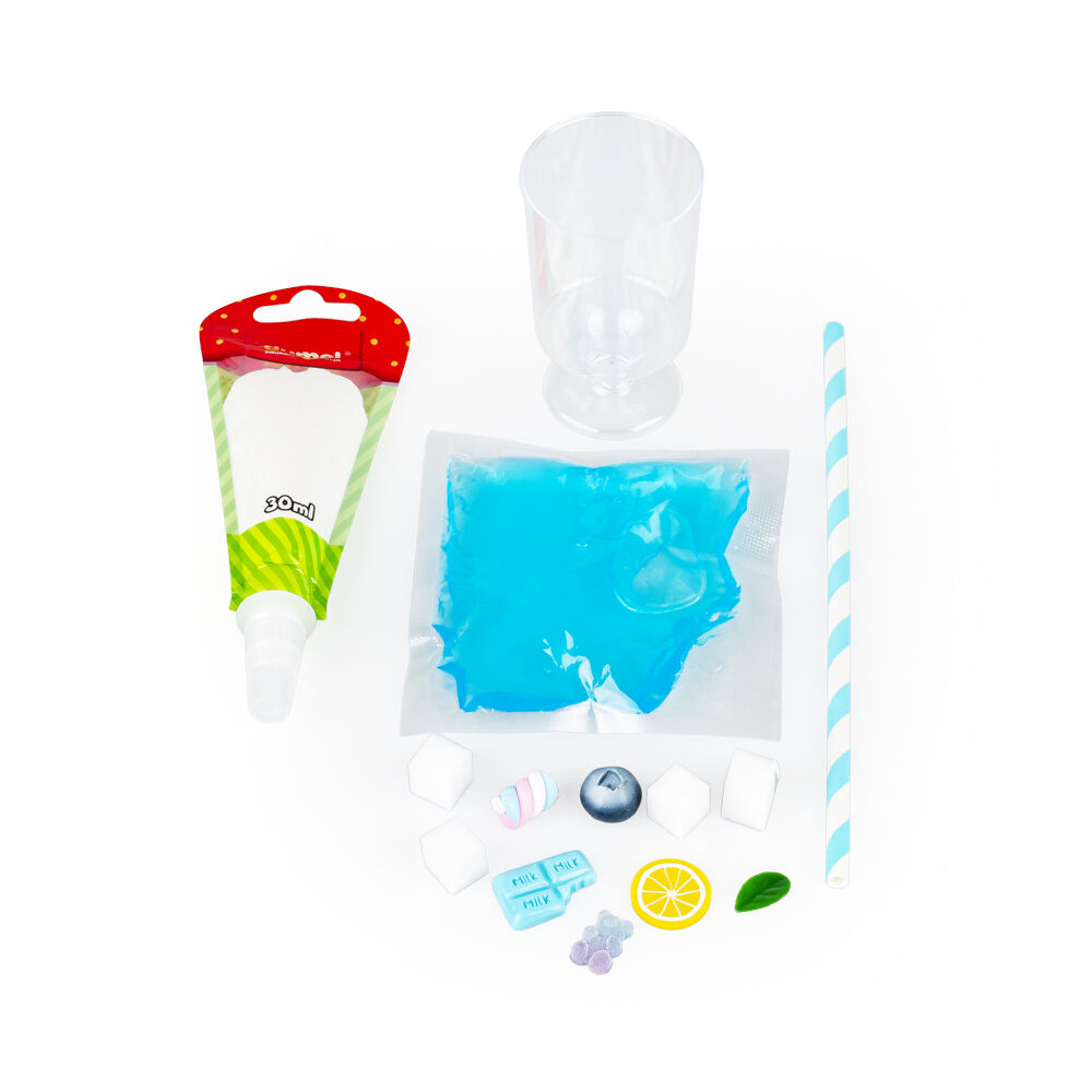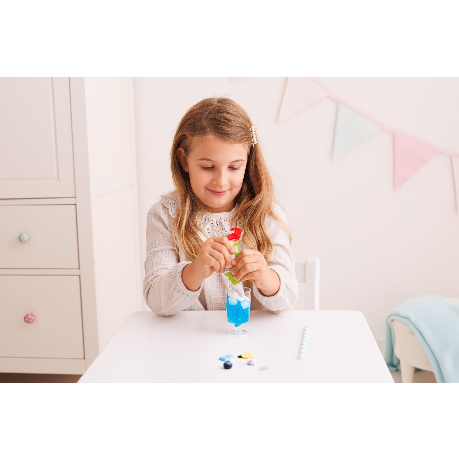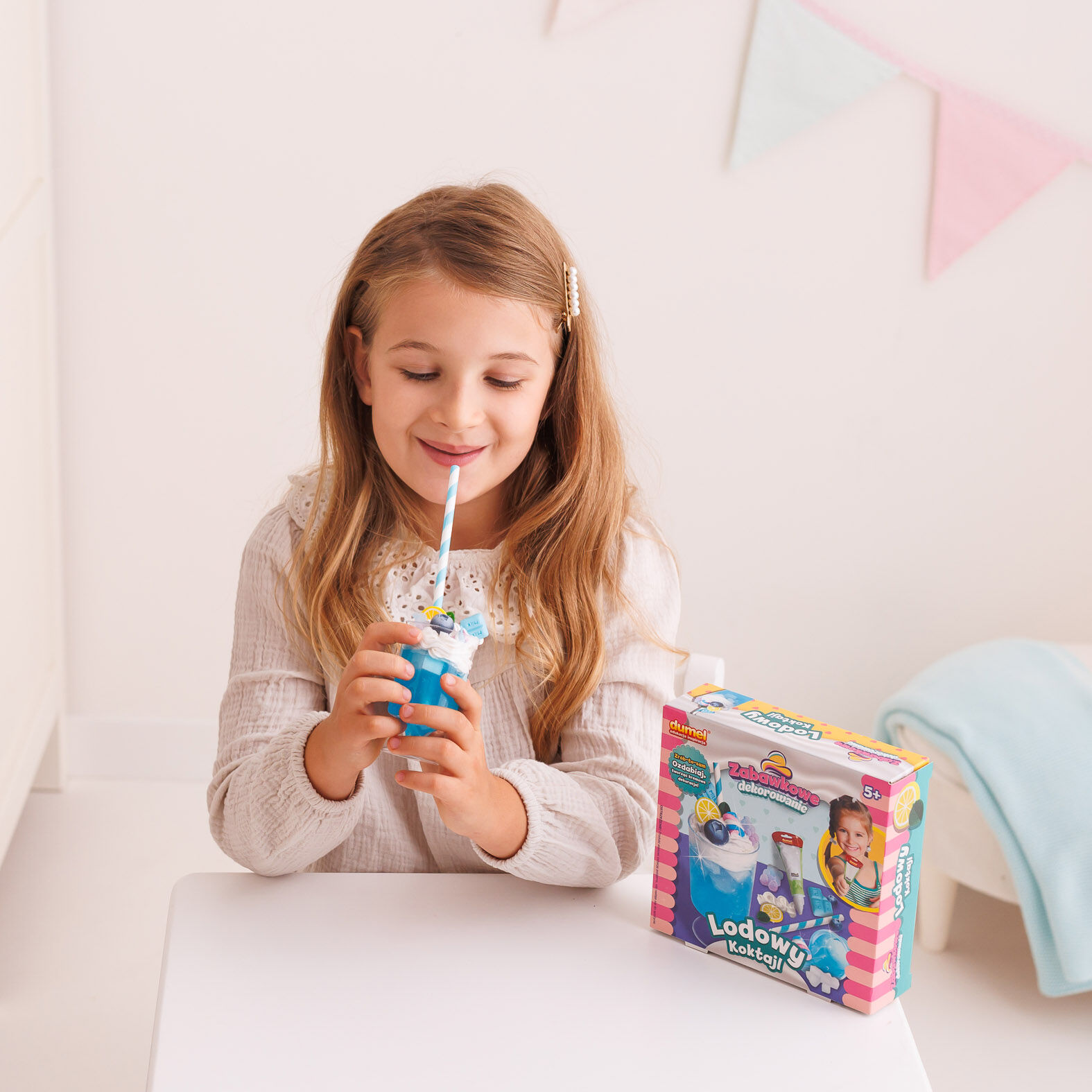 Przygotuj samodzielnie zabawkowy koktajl i udekoruj go tak, jak podpowiada ci własna fantazja! Zestaw zawiera galaretkową masę, imitującą płyn, kremową masę w tubce, plastikowy kubeczek i dodatki do ozdobienia gotowego koktajlu. Gdy skończysz dekorować, pozostaw swój zabawkowy koktajl, aby całkowicie stwardniał, najlepiej na całą dobę.