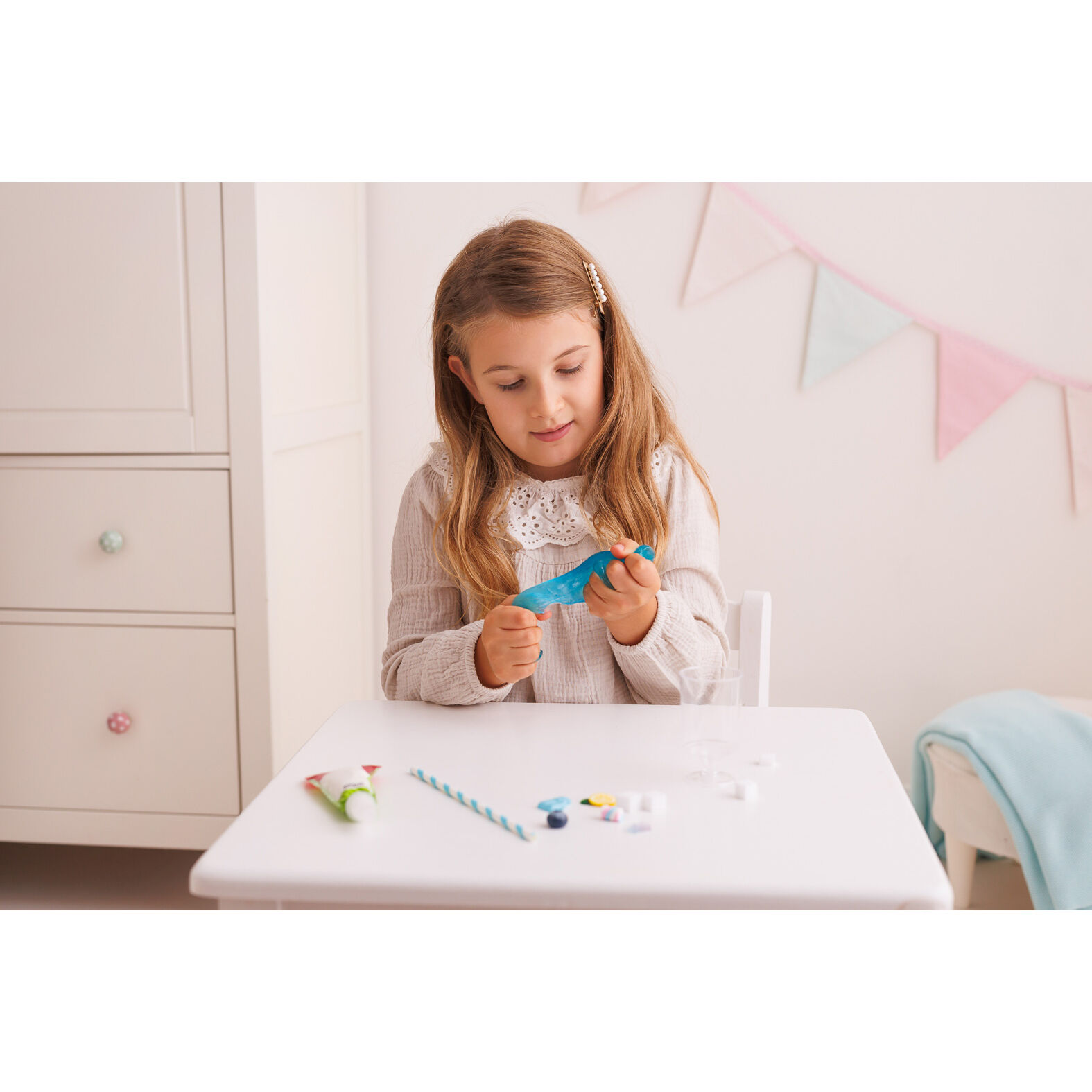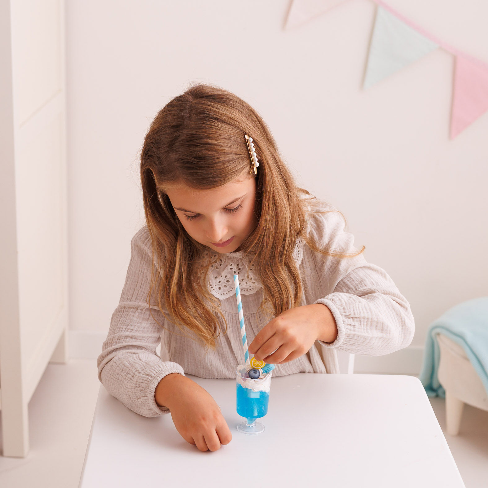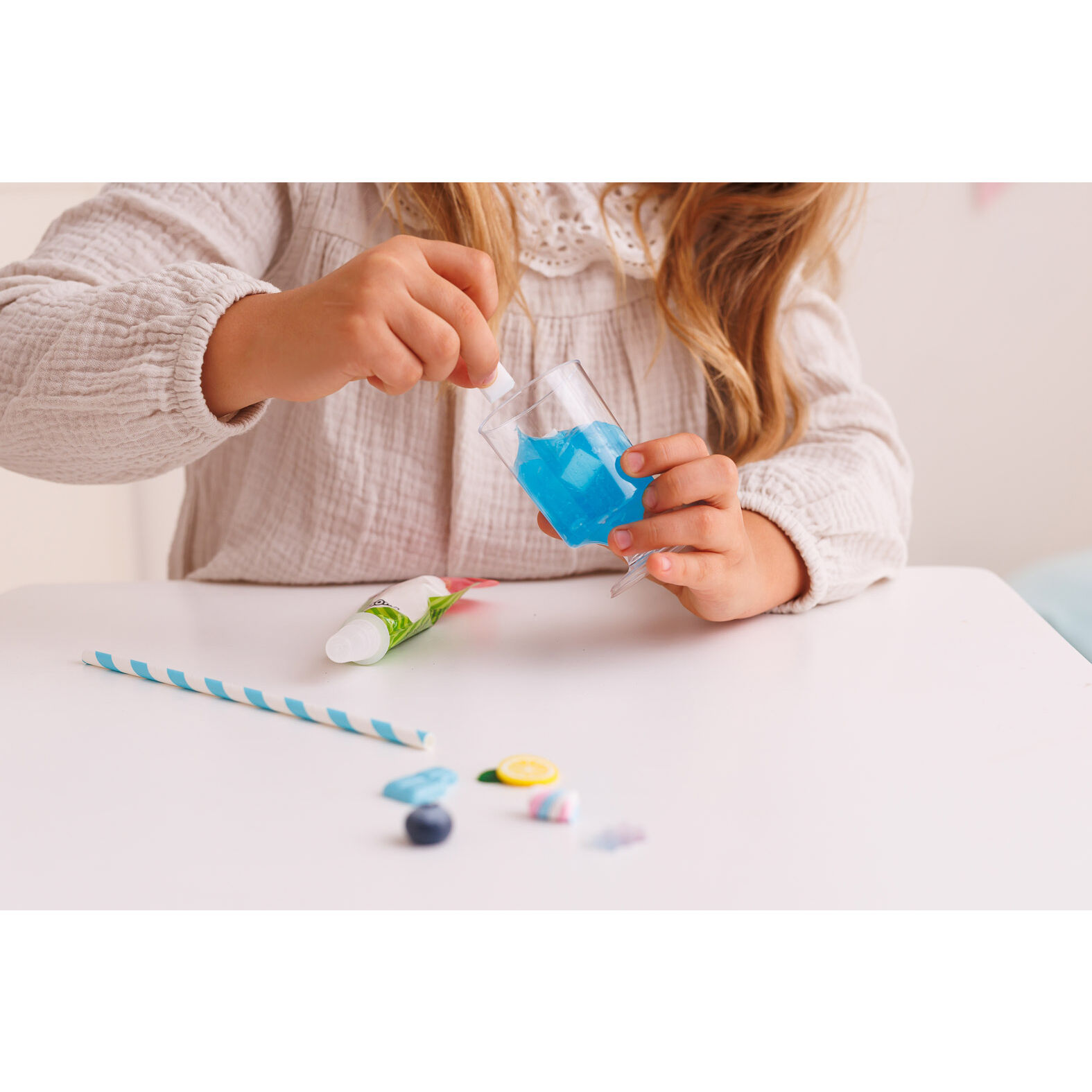 Przygotuj samodzielnie zabawkowy koktajl i udekoruj go tak, jak podpowiada ci własna fantazja! Zestaw zawiera galaretkową masę, imitującą płyn, kremową masę w tubce, plastikowy kubeczek i dodatki do ozdobienia gotowego koktajlu. Gdy skończysz dekorować, pozostaw swój zabawkowy koktajl, aby całkowicie stwardniał, najlepiej na całą dobę.
