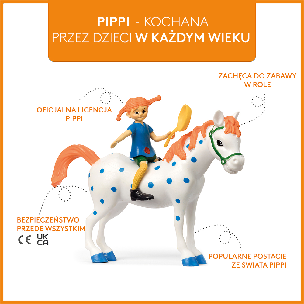 Kiedy Pippi Langstrumpf wsiada na swojego konia Alfonso, przygoda z pewnością czeka na horyzoncie! Prezentowany zestaw zawiera Pippi Langstrumpf, jej ukochanego konia oraz charakterystyczną patelnię, która doda jeszcze więcej radości do zabawy. Ta zabawka dla dzieci zachęca maluchy do twórczej zabawy, pozwala na odgrywanie znanych scen z książek lub wymyślanie własnych, niezwykłych historii. Figurki zostały wykonane zgodnie z oryginalnymi ilustracjami z powieści Astrid Lindgren, co gwarantuje ich wysoką jakość. Zostały zaprojektowane w Szwecji z dbałością o bezpieczeństwo, gdyż nie zawierają ftalanów ani PVC.