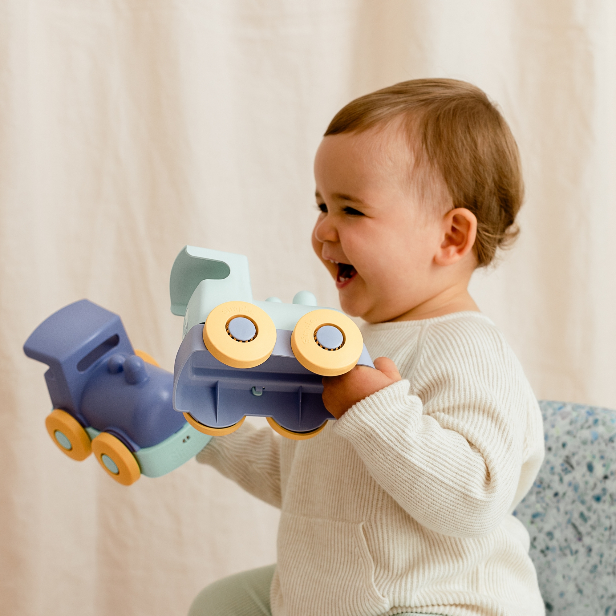 Uroczy kolorowy zestaw 3 zabawek składa się z lokomotywy, piramidalnej układanki z łódeczkami oraz grzechotki, która pełni funkcję gryzaczka dla maluszków. Zestaw pobudza wyobraźnię, rozwija zręczność i koordynację ruchową Twojego dziecka. Wszystkie jego elementy można łatwo umyć choćby w zmywarce do naczyń.