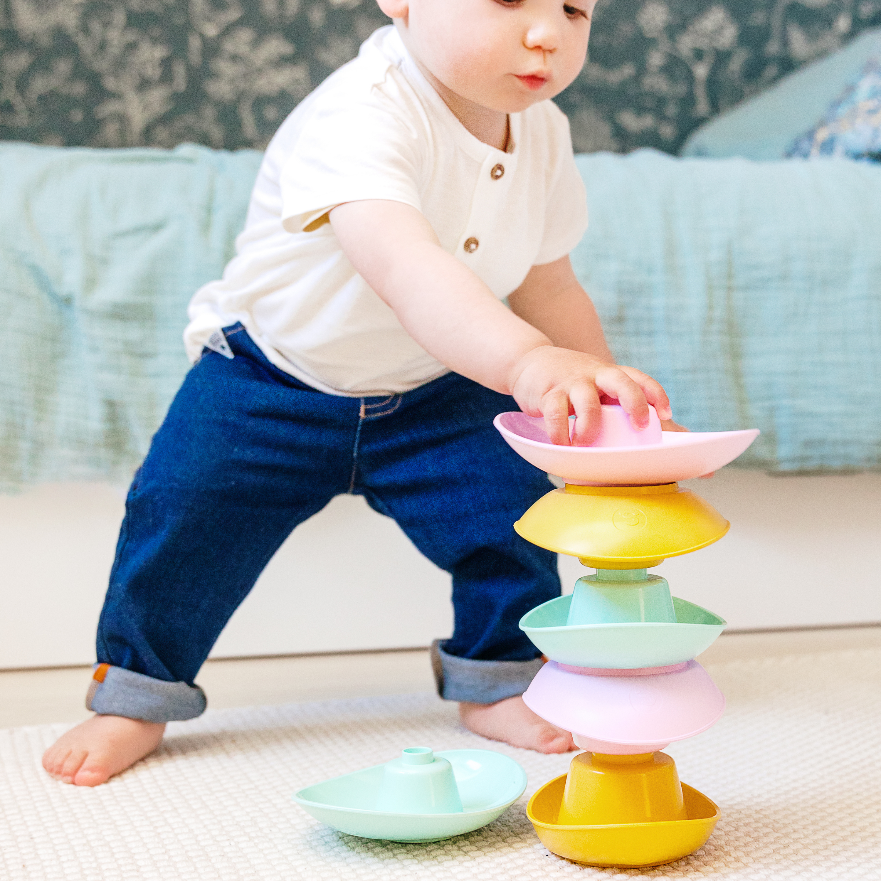 - Zestaw 6 łódek, które można układać pionowo lub poziomo i bawić się nimi niezależnie np. w kąpieli.
