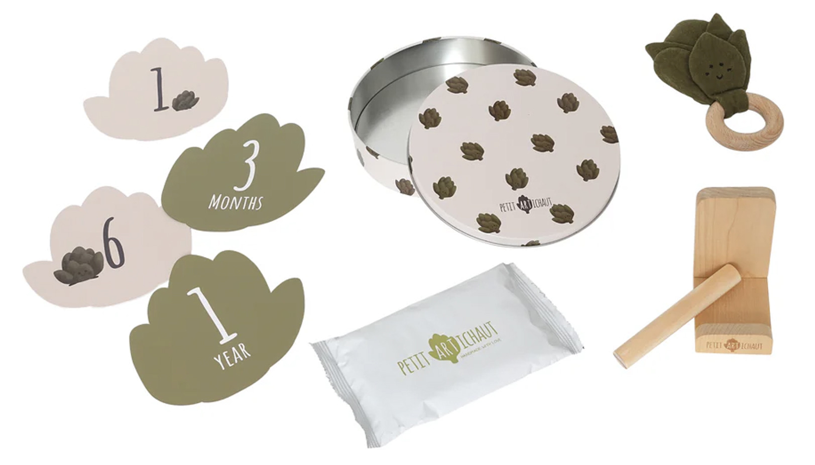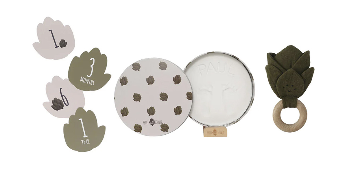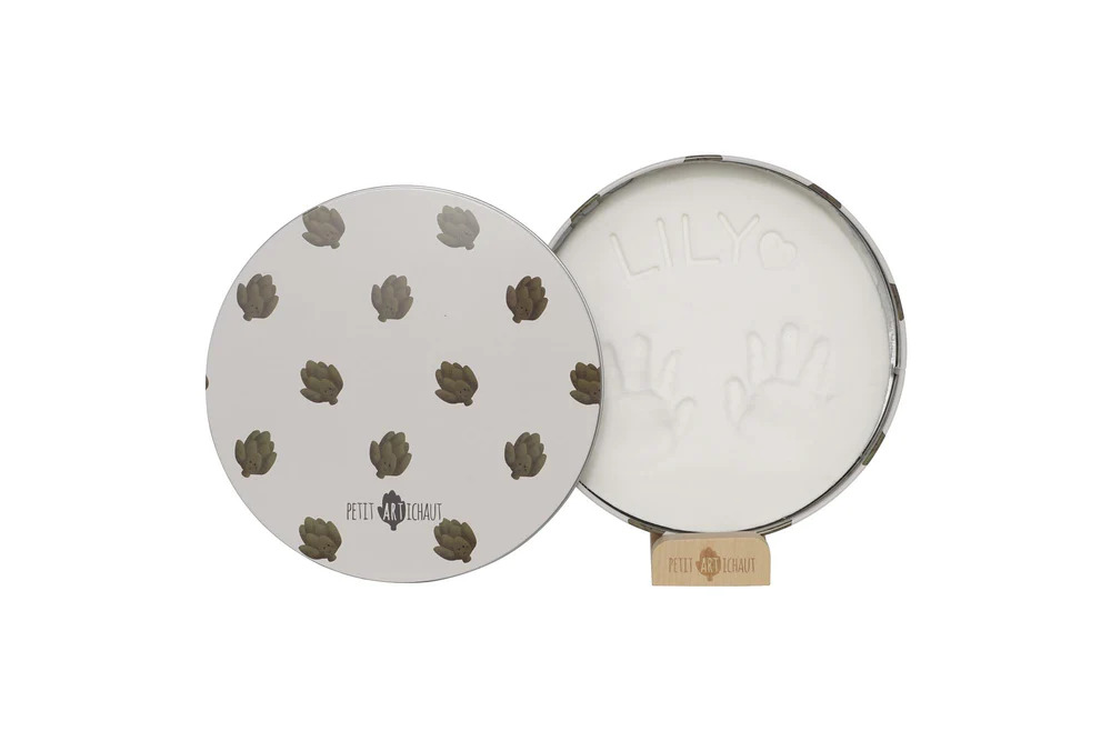 Okrągłe pudełko na odcisk wykonane jest z hipoalergicznej masy i estetycznego stojaka, co pozwala zachować magię pierwszych dni dziecka w bezpieczny sposób. Grzechotka w kształcie karczocha wspiera stymulację sensoryczną, a dziecięce dłonie mogą ćwiczyć chwyt i eksplorację dotykową.