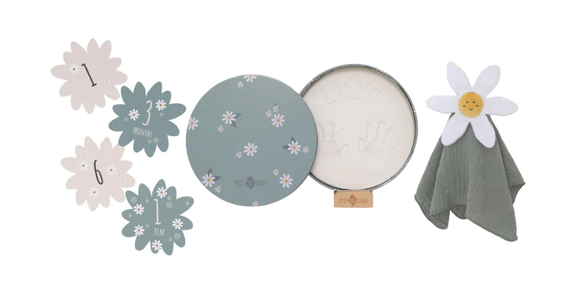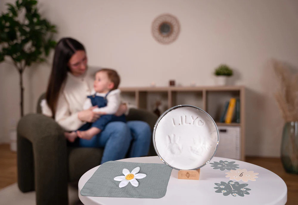 Okrągłe pudełko na odcisk pozwala eksponować odciski dłoni i stóp dziecka dzięki hipoalergicznej masie i eleganckiemu stojakowi, zachowując magię pierwszych dni życia. Maskotka z delikatnym motywem margaretki stanowi towarzysza chwili spokoju i przytulania.