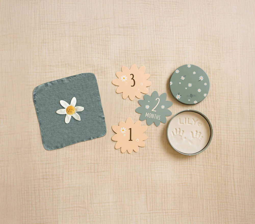 Karty etapów, pięknie wycięte w kształcie kwiatów, pozwalają rodzicom fotografować dziecko co miesiąc i śledzić rozwój w pierwszym roku życia. Zestaw jest praktyczny, poetycki i pełen czułości, idealny na prezent z okazji narodzin.