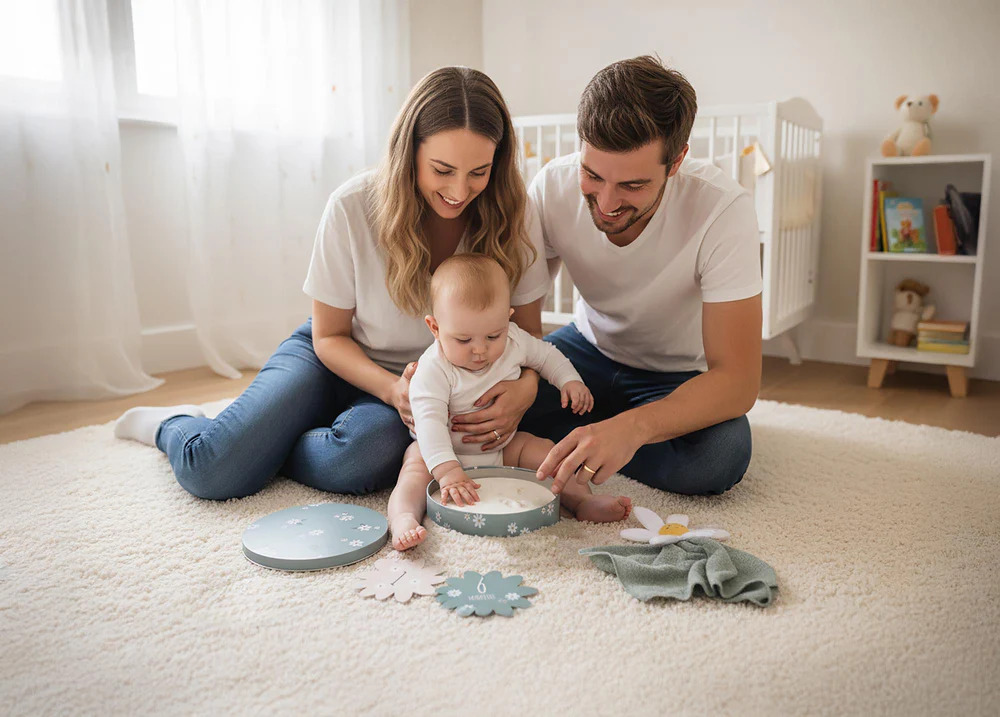 Okrągłe pudełko na odcisk wykonane jest z hipoalergicznej masy i estetycznego stojaka, co pozwala zachować magię pierwszych dni dziecka w bezpieczny sposób. Grzechotka w kształcie karczocha wspiera stymulację sensoryczną, a dziecięce dłonie mogą ćwiczyć chwyt i eksplorację dotykową.