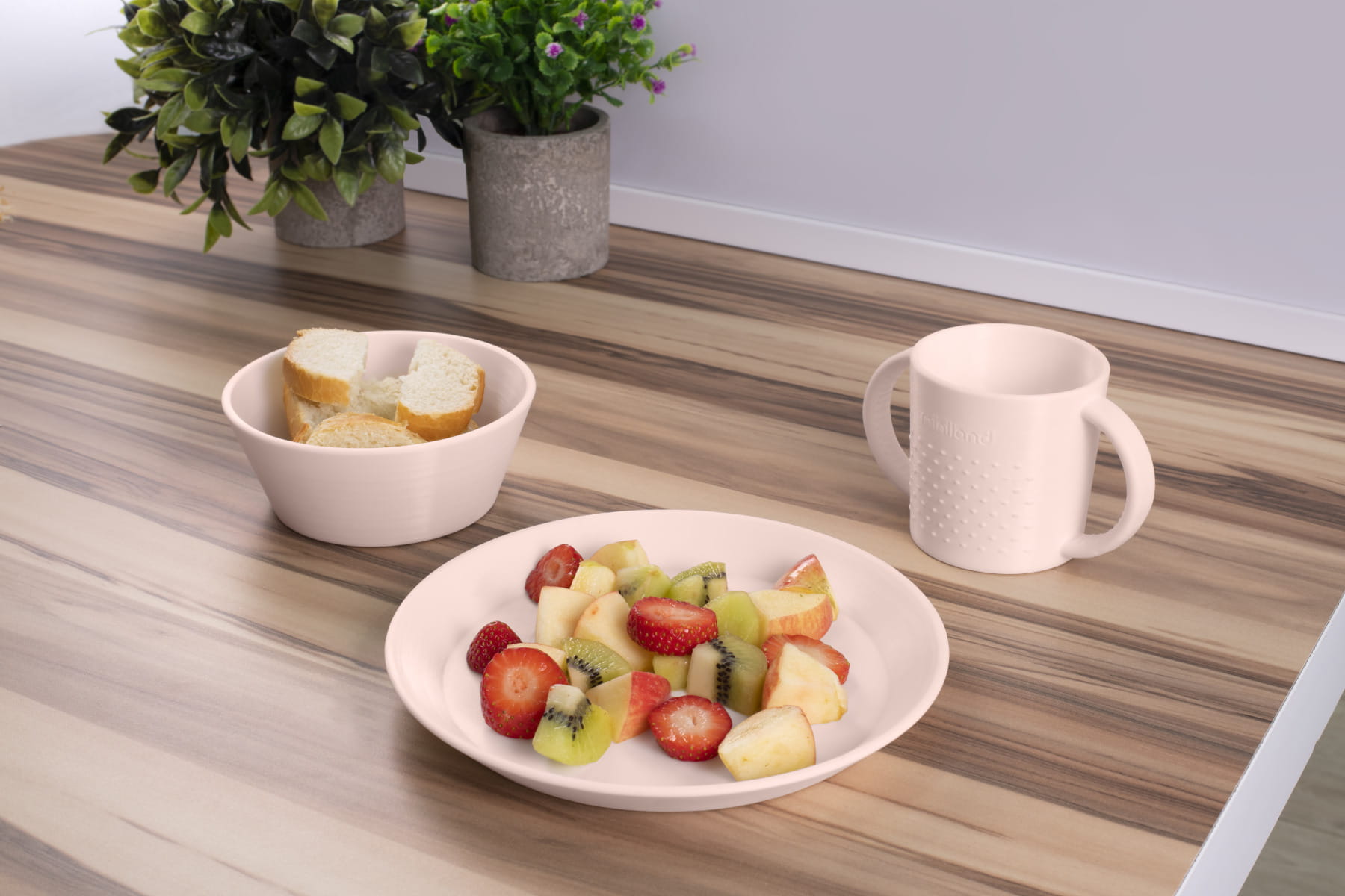 Komplet zastawy stołowej w subtelnym kolorze z delikatnym wzorkiem, gwarantuje, że każdy posiłek stanie się przyjemnością. Najmłodsze dzieci będą uwielbiały swój własny talerzyk, miseczkę i kubek z ulubionym zwierzątkiem.