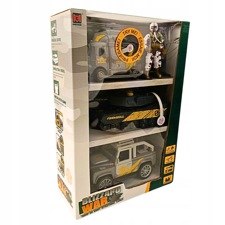 Zestaw wojskowy to doskonała propozycja dla dzieci, które uwielbiają militarne przygody. W jego skład wchodzą trzy dynamiczne pojazdy: helikopter, czołg oraz jeep. Każdy z pojazdów został wyposażony w mechanizm, który umożliwia im poruszanie się, co jeszcze bardziej urozmaica zabawę.